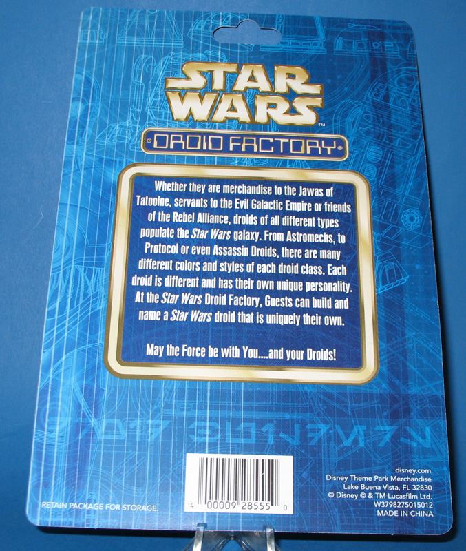 We believe the price was $12.95 each but if you bought two droids they were priced at $21.95. There were no 2-pack bubbles that we saw, just singles, so the discount for two droids was made at the register. The backer card has been updated to the blue color seen in the photos. Instead of the star field background, the new cards have a blueprint feel to them with droid graphics subtly integrated. The text write-up on the back no longer mentions Star Tours but talks about how there are different droids and color schemes in the Star Wars universe. The font for the Droid Factory logo has been updated to what’s seen in the pictures. We were also handed four sticker sheets to name the droids and these appear to be the same as sold with Series 1.