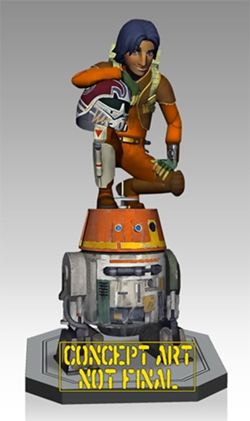 Next is a new maquette featuring two characters from Rebels, Ezra and Chopper. The photo shows the concept art and it hasn’t been approved by Lucas Licensing yet. Chopper, C1-10P, is the new astromech droid that will be helping out the heroes of the show, including young Ezra. The maquette is also due in the first quarter of 2015 and is priced at $120.