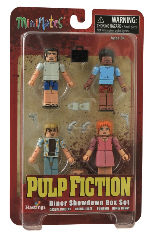 As winter sets in, we near the end of the 20th anniversary of Pulp Fiction, one of director Quentin Tarantino’s earliest and most acclaimed films. Pulp Fiction remains a work of art, with endlessly quotable dialogue, intertwining plot lines (and timelines) and inspired performances by a stellar cast, and Diamond Select Toys has been been honored to translate, chapter by chapter, the world of Pulp Fiction into the language of Minimates mini-figures. Now, a brand-new Pulp Fiction Minimates box set has been released exclusively at Hastings stores and on GoHastings.com!