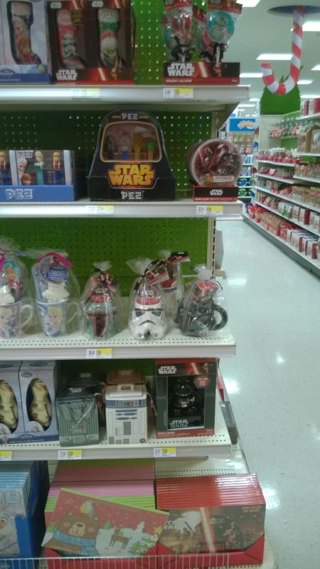 Target stores are setting for the Christmas holiday and along with ornaments and stockings, Star Wars themed candy has started to show up. This year’s offerings include stocking shaped chocolate, lollipops, PEZ, cookie jars with hard candy and the popular mugs.