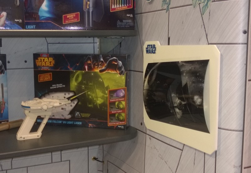 The final item being shown was the Millennium Falcon UV Light Laser. The Falcon comes mounted on a light and sound emitting base and includes a glow-in-the-dark mat and photo transparency of a Star Wars scene. By projecting the light through the transparency and onto the mat, you can create an image that will glow in the dark and can be hung on your wall.